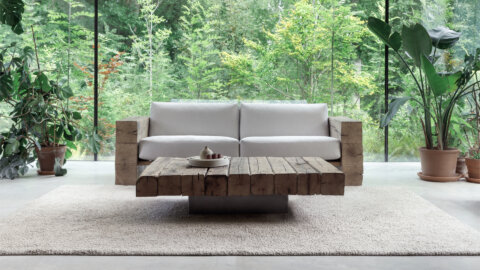 Oakâme’s luxury sofa is crafted from aged wood reclaimed from nineteenth and twentieth century buildings across Eastern Europe. Each product bears a registration plate allowing you to trace the provenance of its solid oak beams.