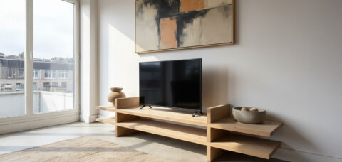 La télévision repose directement sur l’étagère supérieure, parfaitement encadrée par les deux montants verticaux latéraux, ce qui accentue l’effet de mise en scène et d’intégration dans l’espace. Le meuble offre plusieurs niches ouvertes, idéales pour disposer des objets décoratifs, des livres ou des équipements multimédias, tout en conservant une grande légèreté visuelle.