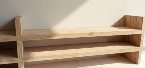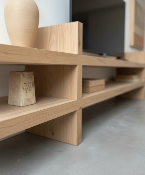 Ce meuble TV se distingue par son design minimaliste et architectural, mettant en valeur la beauté naturelle du chêne massif. Il est composé de deux longues étagères horizontales épaisses, soutenues par deux montants verticaux imposants créant une structure à la fois robuste et équilibrée