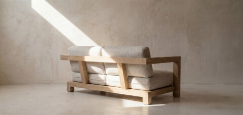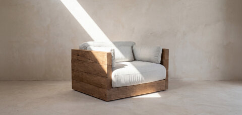Le canapé de luxe Oakâme est composé de bois vieilli récupéré d’anciennes bâtisses d’Europe de l’Est datant du XIXe et du XXe siècle. Chaque produit compte une plaque d’immatriculation qui vous permettra de retracer la provenance de ces poutres de chêne.
