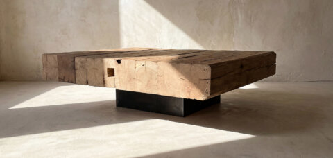 La table basse de luxe Oakâme est composée de bois vieilli récupéré d’anciennes bâtisses d’Europe de l’Est datant du XIXe et du XXe siècle. Chaque produit compte une plaque d’immatriculation qui vous permettra de retracer la provenance de ces poutres de chêne.