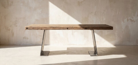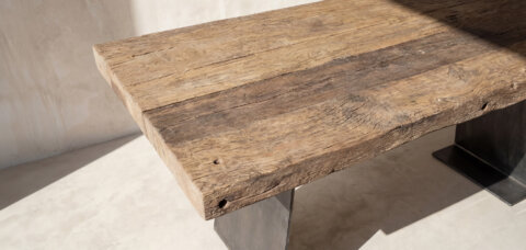 Dans la continuité de son approche artisanale, Oakâme propose sa vision du design en combinant bois ancien et acier inoxydable. Un savant mélange de finesse et rusticité donnant vie à des pièces de mobilier exceptionnelles.