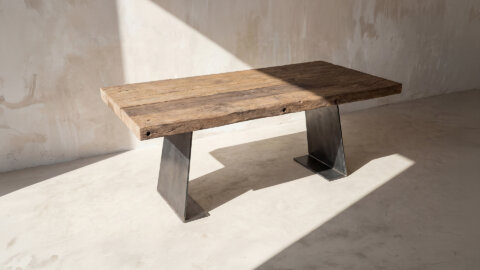 Table à manger en chêne ancien, esprit rustique-industriel. Plateau massif aux veines visibles, chants patinés. Deux pieds en Z en acier noir thermolaqué. Une pièce simple, franche, chaleureuse.